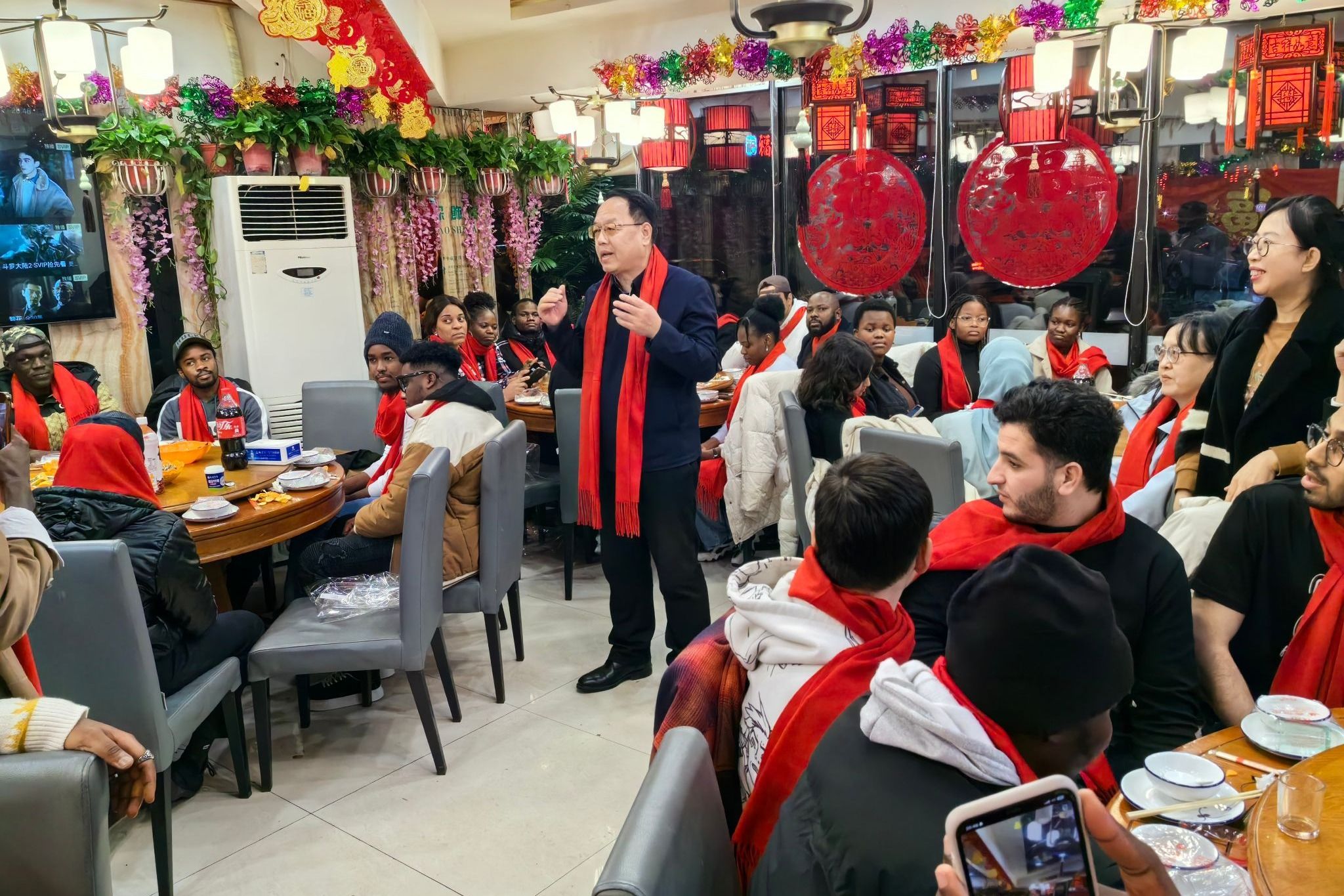 国际教育学院领导班子和教师代表组织52名在沈留学生包饺子、话年俗、表演节目,宣传中国文化,欢度农历新年。贾玉明为留学生送去学校关爱和新春祝福,为他们佩戴红色围巾。张珂为留学生送上对联。校领导详细了解留学生学习、生活情况,叮嘱大家要常与家人、老师联系,希望他们能在中国新年的欢快氛围下,感受中华优秀传统文化,能够在学校度过一个幸福、平安的龙年春节。留学生们表示一定不辜负学校期望,好好利用假期,努力学习,不断充实自我,立志成长成才。