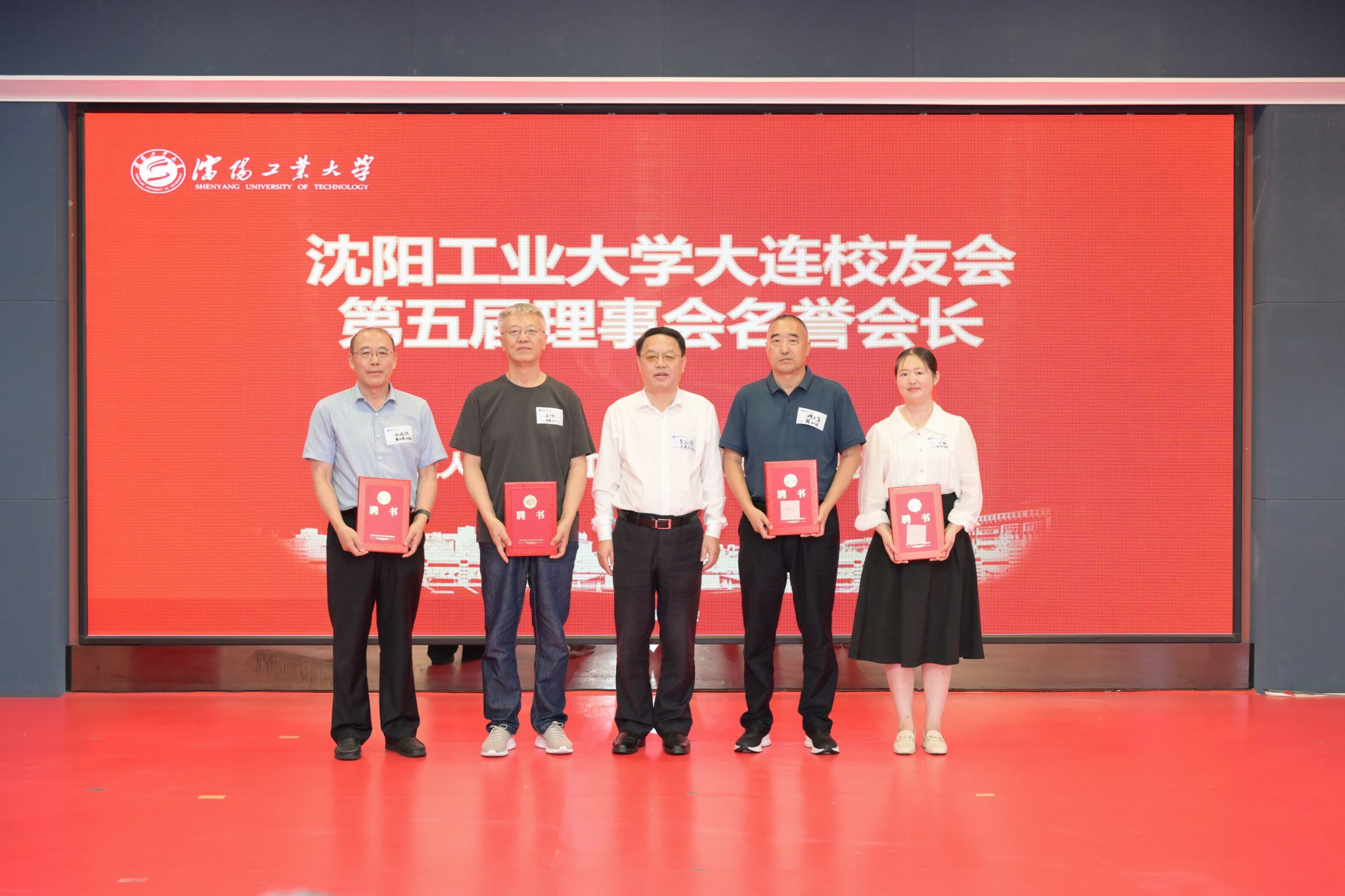贾玉明书记为大连校友会第五届理事会名誉会长任瑞铭(1978级热处理专业)、高航(1978级机械制造专业)、姜怀胜(1978级机械制造专业)、王绍东(1980级半导体专业)、傅文臣(1980级铸造专业)以及理事会成员颁发聘书并授旗。