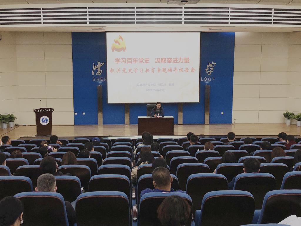 为推进机关党史学习教育深入开展,4月29日,机关党委举办了党史学习教育专题辅导报告会,邀请学校党史学习教育宣讲团团长,马克思主义学院杨乃坤教授作 “中国共产党的创建及其伟大意义”的专题辅导报告,机关100余名党员干部参加了报告会。