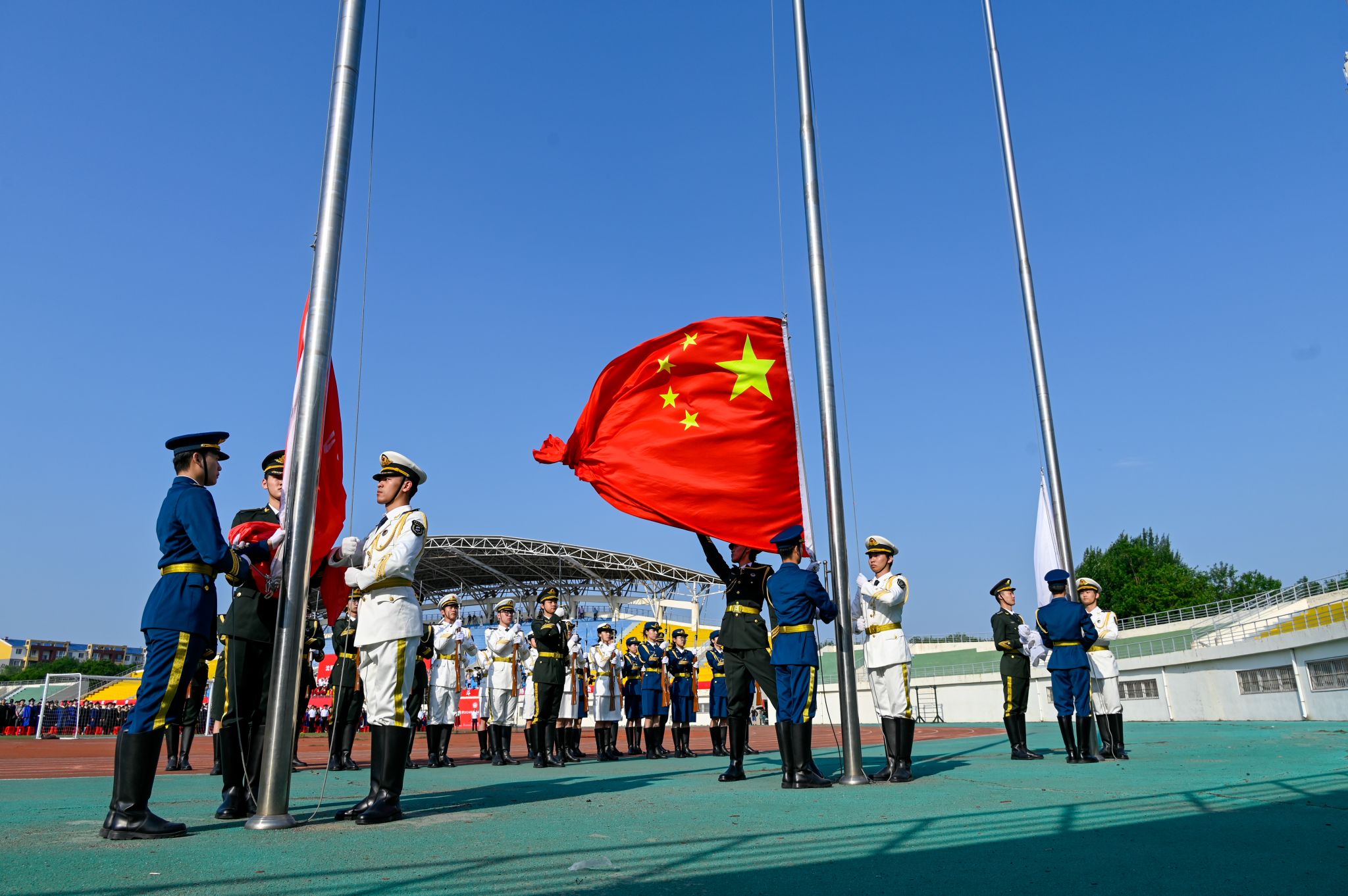 在雄壮的国歌和激昂的校歌声中,身姿挺拔、步履整齐的校国旗护卫队,迎着灿烂的朝阳冉冉升起国旗和校旗。